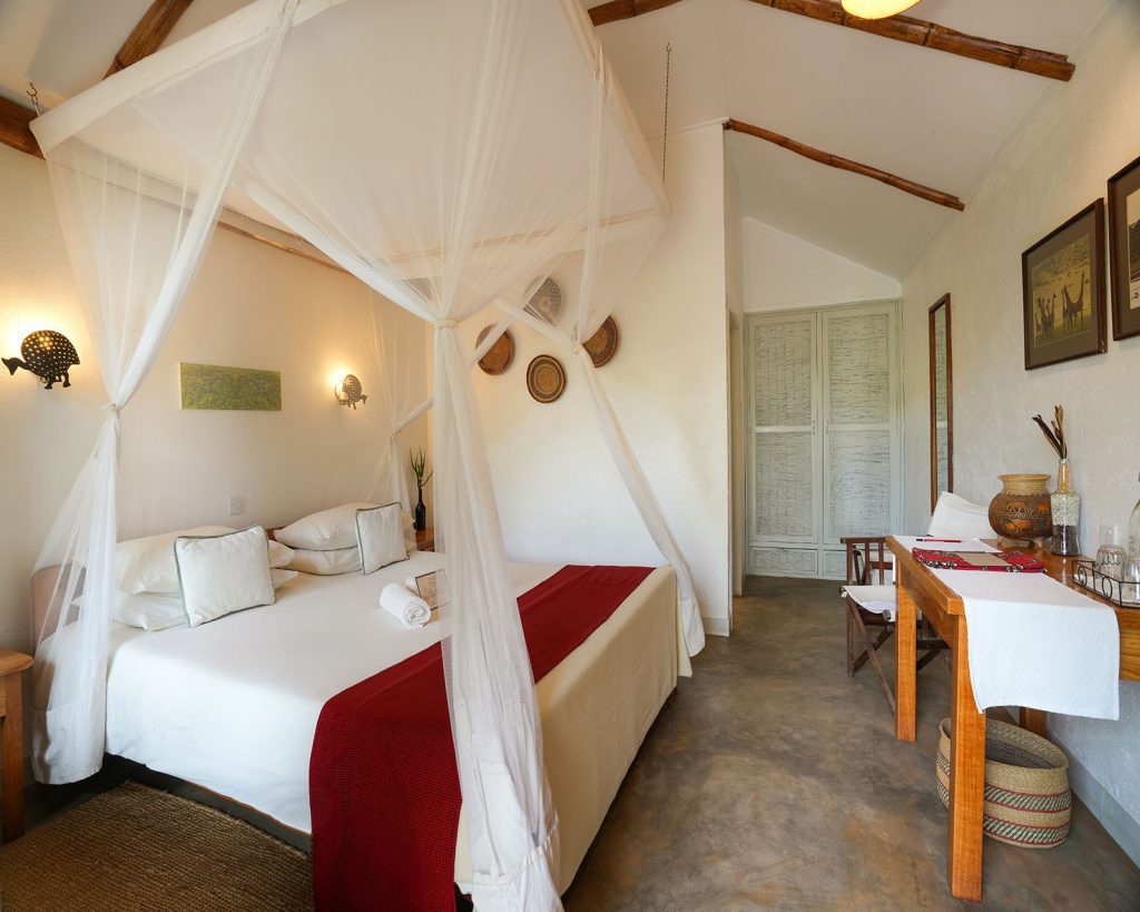 The cottages are built from thick stone walls and traditional thatch, materials that have proven their worth over more than five decades. The stone keeps interiors naturally cool even in the warm African climate, while the thatch roofs blend seamlessly into the landscape. These are not just buildings—they’re part of the environment, designed to shelter without intruding.